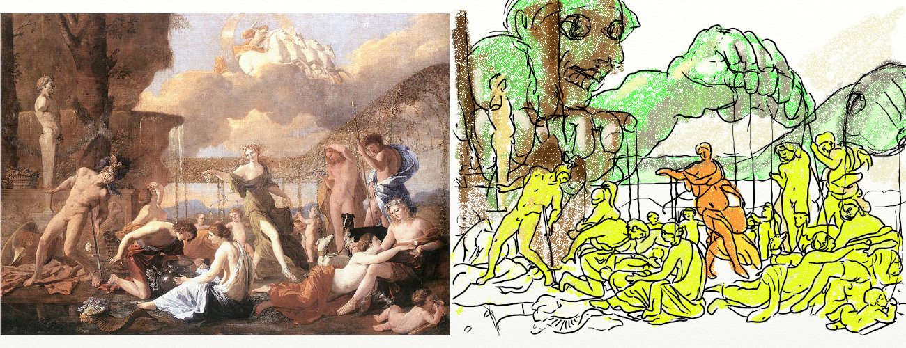アポロンの乗る雲の様子。右のようにぼかしてみると、全く別の物が見えて来る。雲がまるで巨大な爬虫類の顔に見えて来る。巨大なオタマジャクシかカエルのような生物が空に浮かんでいて、地上で踊る人々を呑み込もうとしているような姿である。