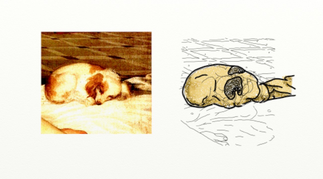 ベッドの右側に子犬が丸まっているのだが、絵の中の人物が誰も視線を向ける事無く、ほったらかしにしている。愛玩動物が描き加えられている意味が無い。